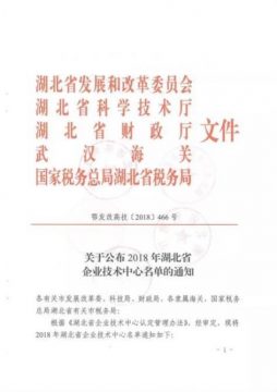 自2018年6月份開始,經初評、答辯評審、現場核查、部門審查等環節,湖北省發展與改革委員會、湖北省科學技術廳、湖北省財政廳、武漢海關、國家稅務總局湖北省稅務局聯合發文(鄂發改高技[2018]466號),正式認定湖北博大生物股份有限公司等58家企業技術中心為第24批湖北省企業技術中心。