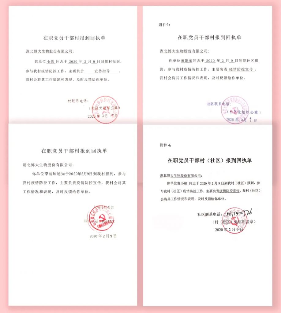 疫情發生之后,在黨中央的統一部署安排之下,在各級黨組織的號召下,我公司支部黨員積極主動到所在村(社區)報到,服從組織統一安排。自2月5日中共黃石市委組織部下發《關于開展在職黨員干部進社區“雙報到” 助力做好疫情防控工作的緊急通知》起,公司在黃全部6名黨員迅速行動,第一時間向所在村(社區)完成黨員雙報到,迅速完成集結并走上防疫崗位。