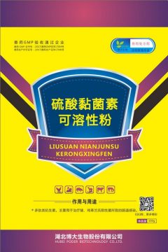 硫酸黏菌素可溶性粉 【主要成分】10%黏菌素 【作用與用途】用于治療畜禽革蘭氏陰性菌所致的腸道感染。 【用法與用量】飲水:500~1000g/噸,混飼:1000-2000g/噸 【包裝】100g/袋×5袋/包×20包/箱